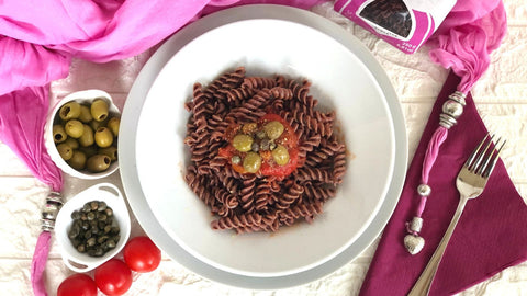 Fusilli di sorgo e barbabietola con Puttanesca vegetale